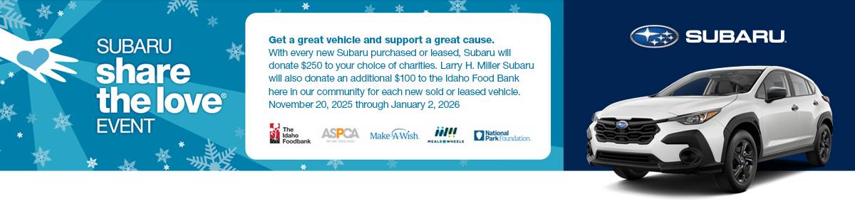 By providing your information or texting and calling us directly, you agree to receive manual, automated and pre-recorded texts, emails, and phone calls from Larry H. Miller Subaru Boise, its parent company Asbury Automotive, and all affiliates including our manufacturer and distributor partners. These informational and marketing communications may be powered by Artificial Intelligence, tailored to give you the most guest-centric experience possible. Messages and data rates may apply.